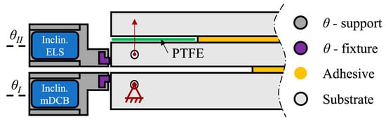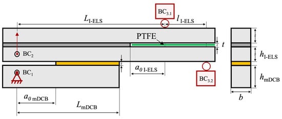 As such, an adaptation of the current concept was devised owing to the inverse end-loaded slip (I-ELS) specimen studied by Budzik and Jumel [,]. Being an inherently stable test and not presenting any need for a crack length compromise, all the ELS-related issues would be solved. Changing to this new concept resulted in the following combined specimen, presented in Figure 18.
