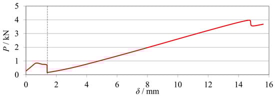 As a preview of the final testing procedure, as previously mentioned, the mode I (mDCB) and II (ELS) fracture tests were merged in the same specimen. These were performed sequentially, and the load–displacement curves were registered by the machine, as seen in Figure 6.