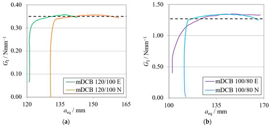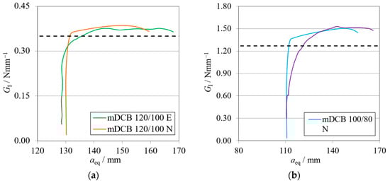 R-curves related to the mDCB specimen of the novel concept integrating the I-ELS mode II component. The black dashed line represents the input GIC value obtained with experimental tests (Table 1). (a) Brittle adhesive; (b) Tough adhesive.
