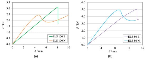 P-δ curves related to the ELS specimen with hII = 12.7 mm. Numerical (N) versus experimental (E) results. (a) Brittle adhesive; (b) Tough adhesive.