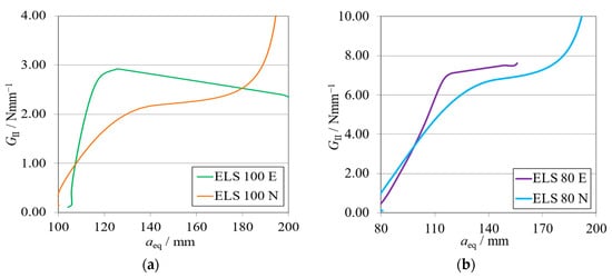 R-curves related to the ELS specimen with hII = 12.7 mm. Numerical (N) versus experimental (E) results. (a) Brittle adhesive; (b) Tough adhesive.