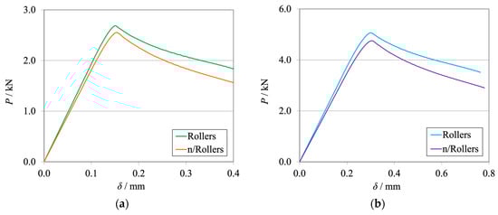 For both adhesives, the load supported by the specimen and its stiffness are higher for the conditions where the rollers are active (Figure 19). This is due to the fact that part of the load is supported by the rollers since they are restricting the free movement of the specimen. Then, lowering the severity of the damage in the mDCB crack results in the need for higher load values to achieve the same critical stress state.