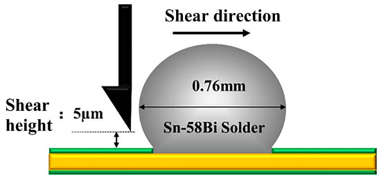 To determine the soldering strength of the solder joints after reflow, a low-speed shear test was performed. The MFM1200 push-tension tester (Hongkong, China) was used for the test, and the testing schematic is shown in Figure 2. The shear rate was 600 µm/s, and the height was maintained at 5 µm from the pad. Once the test was complete, the computer generated a shear curve, which was then used to calculate the result through the shear strength formula. A solder pad measuring 480 μm was used as the soldering area to calculate the shear strength.