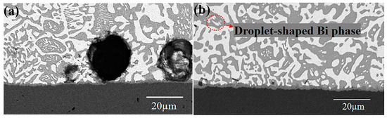 From Figure 3a, a thin IMC layer has formed at the interface between the Sn-58Bi and the Cu pad after the FA reflow. The IMC appears scalloped, continuous, and uniform, indicating a stronger metallurgical bonding of the joint. However, there are visible pores above the IMC layer. It is suspected that the interfacial reaction with the FA atmosphere generated some metal formate and some gas to form the pores during reflow. When the temperature rises above 150 °C, Sn and Cu formates decompose into Sn, Cu, CO2, and H2 [22]. The grey area above the interface is the Sn-rich phase, and the white one is the Bi-rich phase. A less regular lamellar structure has formed between the Sn and Bi-rich phases. The droplet-like structures of the Bi-rich phase are inconsistent with the lamellar structure, most of which exist in the Sn-rich phase. When the Sn–Bi alloy solidifies, the Sn—Bi solder experiences a certain degree of supercooling below the eutectic point. In a short time, the Sn-rich and Bi-rich phases create and form an irregular lamellar eutectic structure. However, in the subsequent cooling process, those small Bi grains in the Sn-rich phase precipitate out due to the low solubility at low temperatures, thus forming the scattered droplet-shaped Bi phase in the Sn phase in Figure 3b [23].