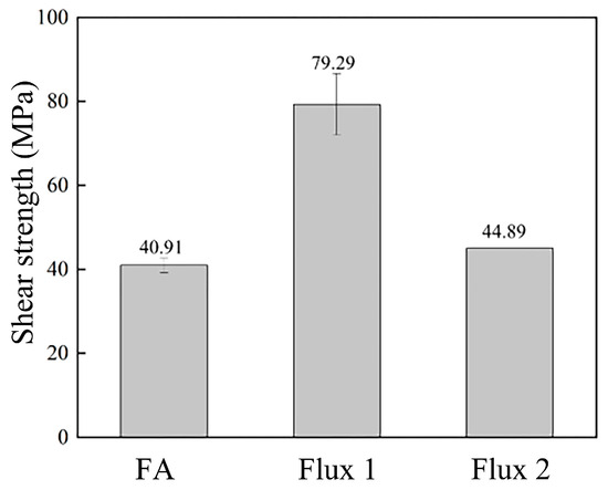 In order to confirm the reliability of the solder joint in the FA atmosphere, the strength of the other two processes was compared. In Figure 4, the shear strength of the FA soldering joint is 40.91 MPa. In comparison, the shear strength of a solder joint using soldering Flux 1 is 79.29 MPa, and one using soldering Flux 2 [24] is 44.89 MPa. The results show that the shear strength of FA soldering in this study is lower than that of Flux 1 but very similar to that of Flux 2, which is used in the literature. Therefore, it can be concluded that the FA soldering of this study performs with a reliable soldering strength.