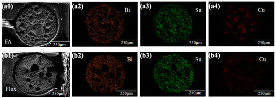 EDS surface scanning energy spectrum of Sn-58Bi after reflow in FA atmosphere process and Flux process: (a1) Fracture SEM of the FA atmosphere, (a2) the EDS mapping of Bi element in (a1), (a3) the EDS mapping of Sn element in (a1), (a4) the EDS mapping of Cu element in (a1); (b1) Fracture SEM of the Flux process, (b2) the EDS mapping of Bi element in (b1), (b3) the EDS mapping of Sn element in (b1), (b4) the EDS mapping of Cu element in (b1).