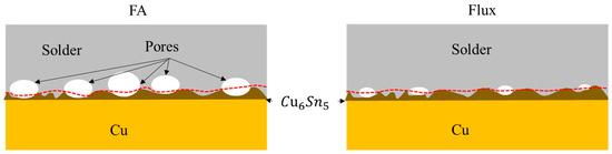 The morphology and elemental distribution on the fracture surface of the joints reflowed under the FA atmosphere are shown in Figure 5. Different colored elements appear in the diagram: orange Bi, green Sn, and red Cu. The main elements are Sn and Bi, indicating that fracture occurs in the Sn-58Bi solder either in an FA atmosphere or with flux. In Figure 6a, the red dotted line indicates the areas of the pores that are larger than 50 µm. Table 1 shows the percentage porosity on the fracture surfaces of the solder joints. The percentage porosity of FA soldering is 32.3%, while that using soldering flux is 5.4%. This means that FA soldering forms large pores which lead to a lower shear strength than flux soldering. In Figure 6b,c, an EDS elemental analysis confirms that the holes are formed above the IMC of Cu6Sn5, which also weakens the FA soldering interface. These results may be because Flux 1 is designed for low-temperature soldering and to remove oxides at a temperature below 200 °C. FA soldering at 200 °C cannot reduce oxides completely, causing large pores to form during reflow. Although the performance of low-temperature FA soldering is worse than that of flux soldering, the former still shows good soldering strength. Improving the process conditions of FA soldering can promote the development of fluxless soldering.