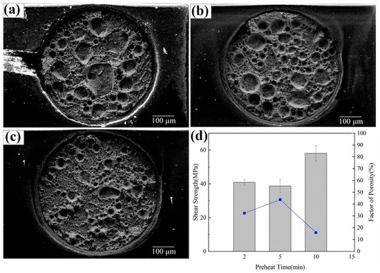 SEM and corresponding shear strength and porosity changes of Sn-58Bi/Cu solder joints formed at different preheating times under FA atmosphere process. Preheating time: (a) 2 min, (b) 5 min, (c) 10 min; (d) the shear strength at different preheating times (column chart) and its corresponding porosity (line chart).