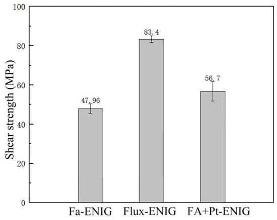 To minimize the formation of pores, it is crucial to address the issue of copper pad oxidation. One effective way to prevent oxidation of the substrate or solder joint is by using ENIG instead of copper pads. Previous studies reported ENIG has great wettability with SAC solder, and the Ni layer can resist the rapid reaction of Cu with Sn to form thick interfacial IMC [25,26]. As shown in Figure 10, the enhancement in the soldering strength of Sn-58Bi by ENIG is significant. The shear strength of Sn-58Bi/ENIG by FA + Pt is 56.7 MPa, which is 44.7% higher than that of Sn-58Bi/Cu (39.19 MPa). Additionally, the shear strength of the Sn-58Bi/ENIG by FA soldering without the Pt catalytic is 47.96 MPa, which is increased by 17.2%. The flux soldering by ENIG enhancement is approximately 4%. Therefore, the ENIG enhancement to FA soldering is effective.