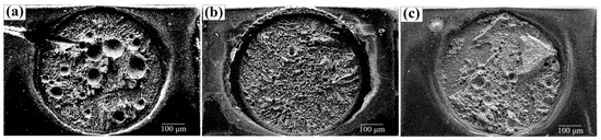 Figure 9 shows the fracture morphology and shear strength of the solder joint with each preheating time. Figure 9a shows the fracture surface of a sheared joint with a preheating time of 2 min and the pores formed in this joint. The porosity cannot be effectively improved by preheating for 5 min (Figure 9b). The porosity ratios of the latter and the former are approximately 42% and 32% respectively. However, when the preheating time is extended to 10 min, the porosity ratio on the fracture surface of the joint decreases significantly (Figure 9c). The fraction of porosity of the 10 min preheat time is 15.8%. Such porosity changes also result in changes in soldering strength. The soldering strength of Sn-58Bi/Cu joints with preheating times of 2 min and 5 min is 42 MPa and 38 MPa, respectively, while the joints with a preheating time of 10 min present the highest soldering strength of 58 MPa. This not only proves that porosity has a great effect on the reliability of FA soldering, but it also shows that increasing preheating time can significantly reduce the formation of pores in the Sn-58Bi/Cu joint. FA can remove the oxide on the metallic surfaces to improve soldering, and appropriately extending the preheating time can provide sufficient time for oxide–reduction by the FA atmosphere. The reduction of soldering interfacial pores enhances the soldering strength. Moreover, the extension of the preheating time can reduce the thermal stresses generated during the soldering process.
