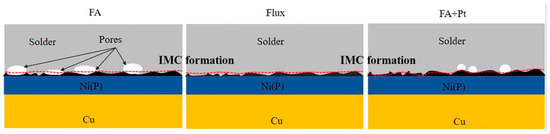 The results as shown in Figure 11, indicate that using the ENIG pad instead of the Cu pad causes a reduction in the porosity of the solder joint by the three processes. Additionally, it reduces the size of the pores formed at the interface. This can be attributed to the isolation of the Au layer on ENIG. This layer protects the underlying metal from oxidation and corrosion and provides an excellent contact surface for the Sn-58Bi solder. However, FA soldering alone cannot effectively reduce the oxide in a short period of time, so the performance difference between ENIG and Cu is only 17%. The Pt catalytic FA atmosphere process increases the strength more than the FA atmosphere process by using ENIG pads because the Pt catalysis makes FA reduce the surface oxide of the Sn-58Bi solder joint more fully.