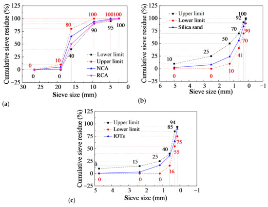Particle gradation diagram: (a) coarse aggregate; (b) silica sand; (c) IOTs.