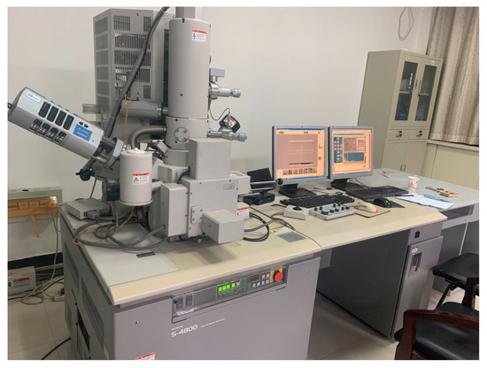 All micrograph tests were conducted at the Materials Analysis and Testing Center of Chang’an University. The microstructure, textural characteristics, and morphological changes in RAC, NAC, and TRAC were obtained by means of a Hitachi S-4800 SEM (Figure 3). Each specimen was approximately 2 cm × 2 cm × 0.5 cm in size. Before the SEM observation, the specimen surface was sprayed with gold to ensure good electrical conductivity. After that, we placed specimens under vacuum for SEM observation. For further elemental composition, EDS line scans were performed using the EDS analyzer.