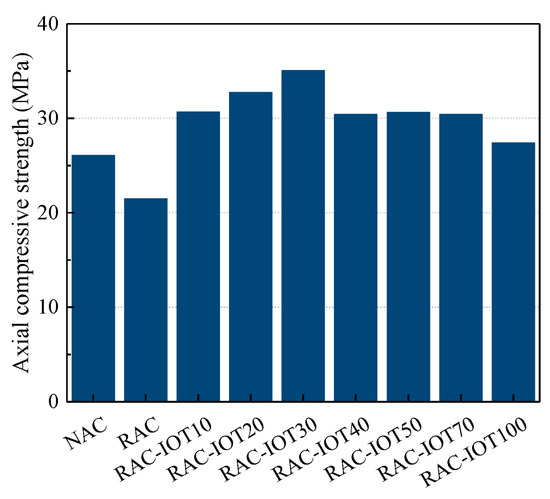 Figure 5 shows the effect of IOT content on the axial compressive strength of specimens. The results showed that the axial compressive strength of NAC was 21.3% higher than that of RAC. The axial compressive strength values increased with the rise in IOT content when the content of IOTs was less than 30%. However, the strength decreased when the IOT content increased to more than 30%. Notably, the axial compressive strength of TRAC with various IOT contents was always higher than that of RAC, and some were even higher than that of NAC in this study. The axial compressive strength reached a maximum in the concrete with 30% IOTs. Therefore, the adverse effects caused by the use of RCA could be compensated for by incorporating IOTs into RAC, and the axial compressive strength of NAC can also be improved by incorporating IOTs into NAC; this fully illustrated the void filling performance of iron tailing particles.