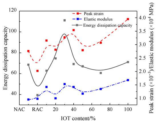 The energy dissipation capacity of concrete is shown in Figure 6. RAC had the lowest energy consumption capacity. The energy dissipation capacity of RAC can be improved by adding IOTs. When the content of IOTs was less than 30%, the energy dissipation capacity increased with the increase in the IOT content. Meanwhile, when the content of IOTs exceeded 30%, the opposite trend was observed.