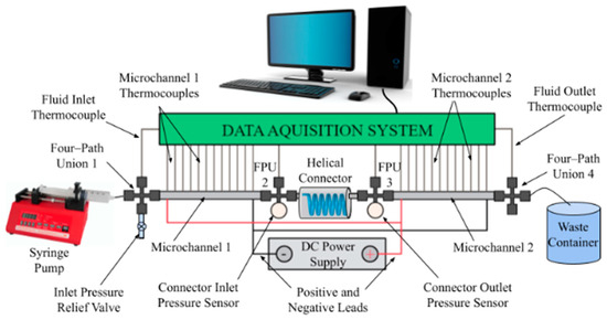 A New Era Systems’ Ne-8000 pump (Farmingdale, NY, USA) equipped with a Chemglass 50 mL syringe was used to introduce the working fluid into the system, where it then flowed into a segment of Luer-Lock tubing (Hamilton 86510, De Pere, WI, USA). Four-path unions (FPU) (Cole-Parmer EW-02008-26 High-Pressure Union, Vernon Hills, IL, USA) were placed at the inlet and outlet of each microchannel, and all were fitted with a 0.2 mm K-type thermocouple (Omega Engineering 5TC-TT-K-30-36, Norwalk, CT, USA) to read the fluid temperature at the inlet and outlet of each microchannel. The first four-path union was also equipped with an in-line pressure relief valve (Industrial Specialties Mfg. PRV-30#-PC, Englewood, CO, USA) rated at a cracking pressure of 30 psi, allowing fluid to escape if pressure drop reached potentially damaging levels. Fluid flowed through the first four-path union into the first stainless-steel microchannel. Each stainless-steel microchannel had an internal diameter of 116 μm and a length of 165 mm (Hamilton 23s gauge, De Pere, WI, USA) and was equipped with 11 82 μm thermocouples (RS Pro 397-1589 K-type, Auckland, New Zealand) placed 10 mm apart, attached with thermally conductive epoxy (Duralco 132 Resin and Hardner, Brooklyn, NY, USA), to read the temperature distribution along the stainless-steel channel. For thermal insulation, a 1 cm layer of 3M scotch-weld 2214 epoxy glue (2214-HD-GRAY-6OZ, 3M, St. Paul, MN, USA) was added, surrounding each microchannel to ensure heat was not lost to the surroundings and accurate measurements were taken.