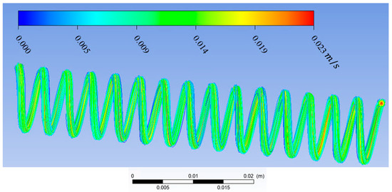 Velocity vectors, streamlines, and velocity contours of a helical connector when , , , and . Working fluid was deionized water, and Re = 400.