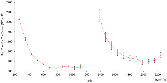 Heat transfer coefficient vs. non-dimensional location, . Working fluid was deionized water, Re = 300, , , , . The red dotted line displays the variation of heat transfer coefficient in each microchannel and error bars have been included displaying the standard deviation of heat transfer coefficient at each point measured.