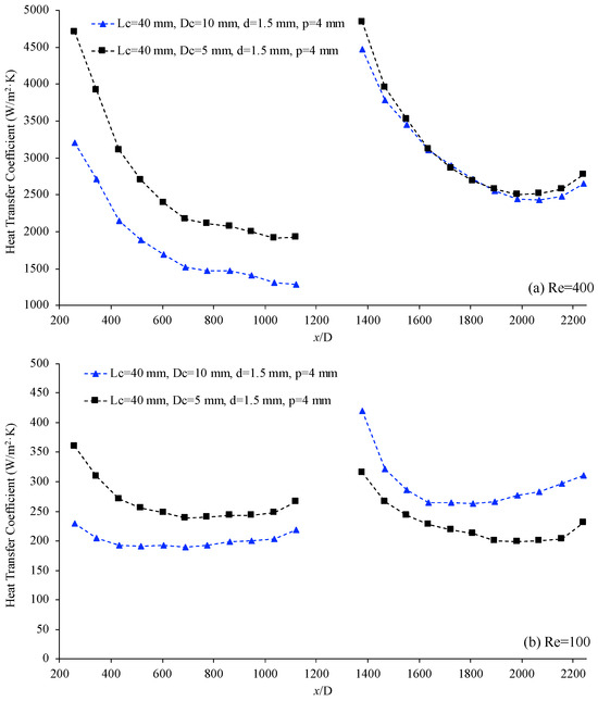 Figure 10 below displays the variation of the heat transfer coefficient, , as a function of non-dimensional location, (x/D) for two helical connectors with different helical diameters. The characteristics of the helical connectors are (I) , , , and (II) , , , . For both cases, the working fluid is deionized water, and the Reynolds numbers are 400 and 100 for Figure 10a and Figure 10b, respectively. At Re = 400, the heat transfer coefficient is almost same for and 5 mm. However, the level of heat transfer coefficient enhancement for connector (I), , is higher than that of connector (II), . For lower Reynolds numbers, including Re = 100, connector (I) shows a higher heat transfer coefficient in the second microchannel, demonstrating that in lower Reynolds numbers, the level of heat transfer coefficient enhancement is higher in the connector with the larger helical diameter. For the given conditions, the centrifugal force and secondary flow motion may increase as the diameter of the helical connector decreases. Therefore, the secondary flow motion may act as a stabilizer and decrease the molecular (and possible nanoparticle) random motion. Consequently, for given conditions, the second channel may show heat transfer coefficient reduction as the diameter of the helical connector decreases.