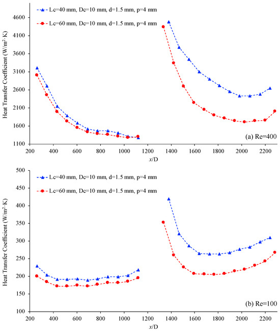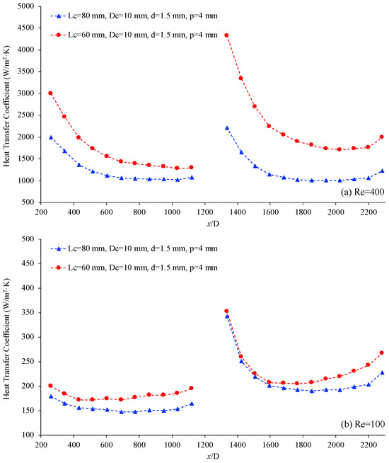 Figure 11 below shows the variation of the heat transfer coefficient, , as a function of location , for two helical connectors with different helical lengths. In this case, the characteristics of the helical connectors are (I) , , , and (III) , , , , the working fluid is deionized water, and the Reynolds numbers are 400 and 100 for Figure 11a and Figure 11b, respectively. This figure demonstrates that the heat transfer coefficient decreases as the length of the connector increases, for the given conditions. As the length of the connector increases, the connector may act more as a stabilizer. If the connector acts like a stabilizer on the fluid flow, molecular random motion may decrease, consequently causing a decrease in the heat transfer coefficient in the second channel as the length of helical connector increases.