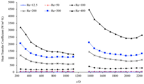 Figure 13 below shows the variation of the heat transfer coefficient as a function of non-dimensional location, , with the use of helical connector (I) in between, at various Reynolds numbers. In this case, the working fluid was deionized water, and the Reynolds number was between 12.5 and 400. This figure shows that the heat transfer coefficient increased as the Reynolds number increased in both microchannels. It has been well established [29,30,31] that as the Reynolds number increases, the molecular random motion of molecules increases, therefore causing an enhancement in the heat transfer coefficient.