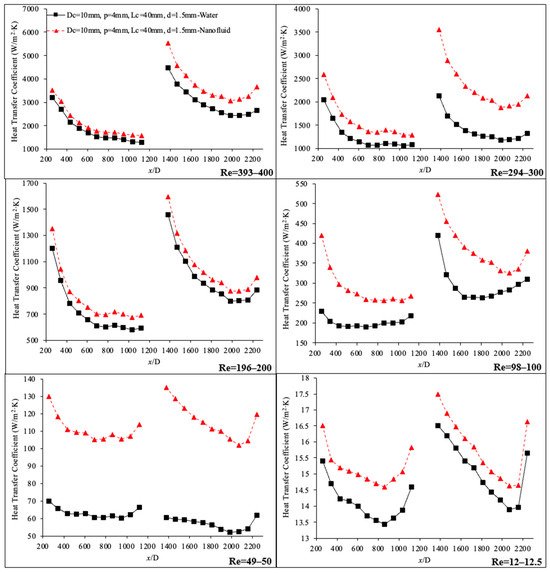 Heat transfer coefficient vs. non-dimensional location, , in connector (I). Working fluid was deionized water (black) and deionized water–nanodiamond nanofluid (red) with mass concentration of 0.1 wt%, Re = 12.5–400.