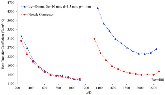 Heat transfer coefficient vs. non-dimensional location, for connector (I) (blue) and nozzle-shaped connector (red) [25]. Working fluid was deionized water, Re = 400.4.