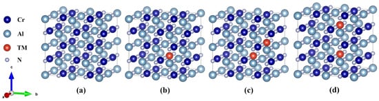The supercells of (a) Cr0.5Al0.5N, (b) Cr0.47Al0.5TM0.03N, and (c) Cr0.44Al0.5TM0.06N (neighbor) and (d) Cr0.44Al0.5TM0.06N (second-nearest neighbor), where TM = Ti, V, Y, Zr, Hf, and Ta.