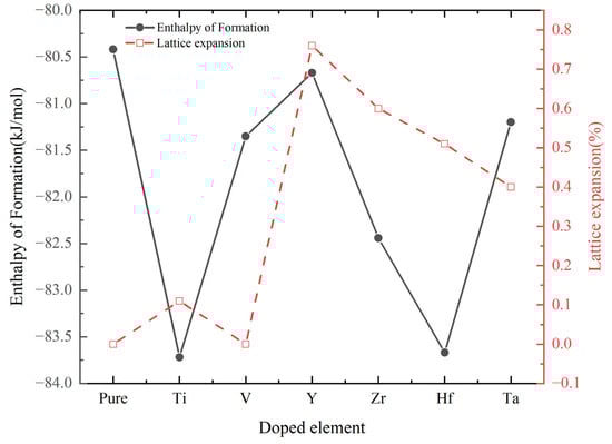 Further increasing the solid solution amount of TM, the corresponding first-principles calculated structure properties and enthalpy of formation are listed in Table 2 and Figure 3. From the above calculation results, compared with Cr0.5Al0.5N, except that V addition shrinks the lattice, the lattice will expand when the solid solution amount of TM further increases. The primary reason for this phenomenon is the difference in atomic radii. Among the six elements Cr, V, Ti, Y, Hf, and Zr, V has the smallest atomic radius, measuring 1.34 Å, which is smaller than Cr’s 1.36 Å. On the other hand, the atomic radii of Ti, Y, Hf, and Zr are all larger than Cr’s atomic radius. Notably, Y has the largest atomic radius at 1.80 Å, making the lattice expansion percentage of Cr0.44Al0.5Y0.06N the highest, reaching 1.37. The lattice constant of the experimentally prepared Cr0.44Al0.5Ta0.06N is 4.117 Å, which is in good agreement with the calculated value 4.121 Å in this paper. Moreover, Cr0.44Al0.5Ti0.06N is energetically more favorable among doped compounds.