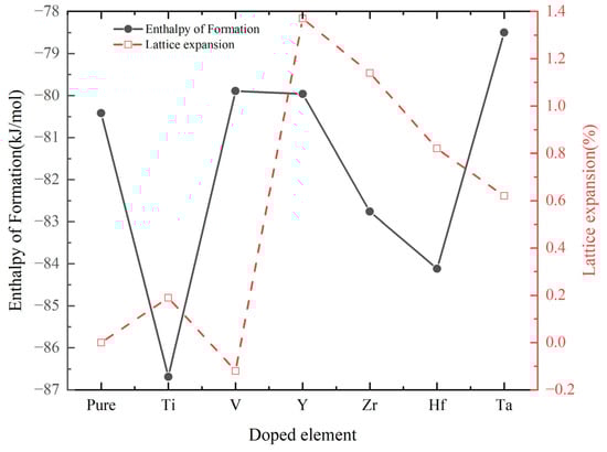 Fitting the energy–volume data points with Equation (1), the first-principles calculated structure properties and enthalpy of formation of doping one TM (TM = Ti, V, Y, Zr, Hf and Ta) atom in the unit cell are shown in Table 1. For a clear comparison, Figure 2 summarizes the calculated values of structural properties and enthalpy of formation. It can be seen that the atomic radius is the main factor affecting the lattice parameters, the atomic radius of Y is the largest among the dopant elements, the volume of Cr0.47Al0.5Y0.03N is the largest. The volume and lattice constant of the unit cell expand due to the dopant elements, except for V. The lattice parameter 4.115 Å of Cr0.36Al0.62Ta0.02N calculated by Hollerweger [] is close to the calculated value in this paper. The chemical stability of solid solution Cr0.5-xAl0.5TMxN (TM = Ti, V, Y, Zr, Hf, and Ta) can be studied by the enthalpy of formation with Equation (2). Among the doped compounds, the most energetically favorable doping is observed when Ti is introduced into Cr0.5Al0.5N.