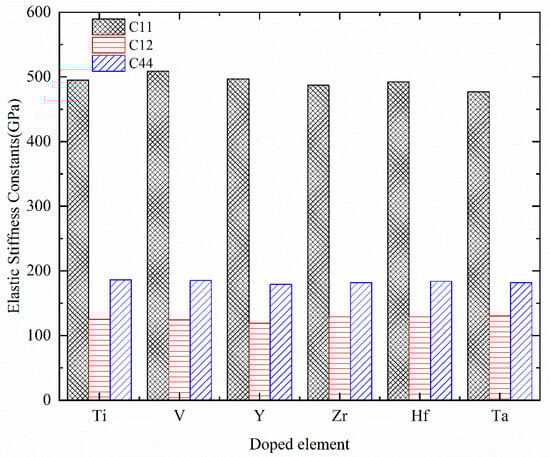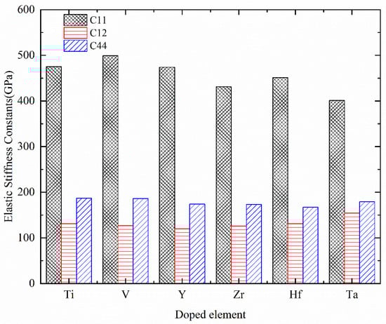 Table 3 summarizes the first-principles calculated elastic stiffness constants Cij of Cr0.47Al0.5TM0.03N, where TM = Ti, V, Y, Zr, Hf, and Ta. Additionally, a histogram illustrating the variation of elastic stiffness constants is presented in Figure 4. It can be observed that the results of Cr0.5Al0.5N are in good agreement with the theoretically predicted values [], and only some discrepancies exist. Considering the deviation in the research method, the discrepancy is acceptable.