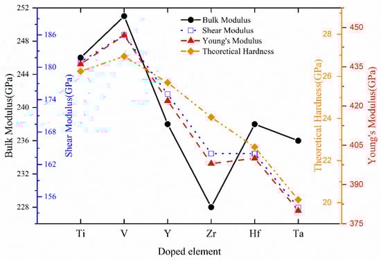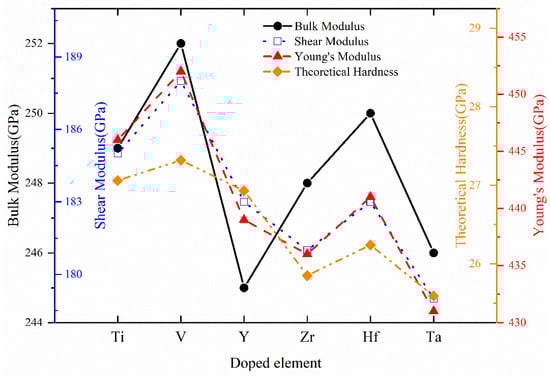 According to elastic stiffness constants, the aggregate polycrystalline mechanical properties such as bulk modulus B, shear modulus G, Young’s modulus E, Poisson’s ratio v, Pugh’s ratio B/G, Zener’s anisotropy A, and theoretical hardness HV of Cr0.5Al0.5N and Cr0.47Al0.5TM0.03N (TM = Ti, V, Y, Zr, Hf, and Ta) are calculated and listed in Table 4. For convenience of comparison, the variation trends of bulk modulus, shear modulus, Young’s modulus, and theoretical hardness are shown in Figure 5. The bulk modulus B reflects the resistance to compression and the strength of the chemical bond, which is defined as the ratio of the change in pressure to the fractional volume compression. According to Table 4 and Figure 5, Cr0.5Al0.5N and all Cr0.47Al0.5TM0.03N (TM = Ti, V, Y, Zr, Hf, and Ta) compounds possess a comparatively high bulk modulus, which reflects great resistance to volume deformation and strong chemical bond strength in the crystal. All Cr0.47Al0.5TM0.03N (TM = Ti, V, Y, Zr, Hf, and Ta) compounds possess lower bulk modulus than Cr0.5Al0.5N. Cr0.47Al0.5V0.03N possesses the highest bulk modulus among doped compounds, which implies that it has a greater rigidity. Generally, the bulk modulus is also used to measure the ability of materials to resist external forces []. Therefore, we can know the order of the ability to resist external forces according to the order of bulk modulus values from small to large as follows: Cr0.47Al0.5V0.03N > Cr0.47Al0.5Ti0.03N > Cr0.47Al0.5Hf0.03N > Cr0.47Al0.5Zr0.03N > Cr0.47Al0.5Ta0.03N > Cr0.47Al0.5Y0.03N.