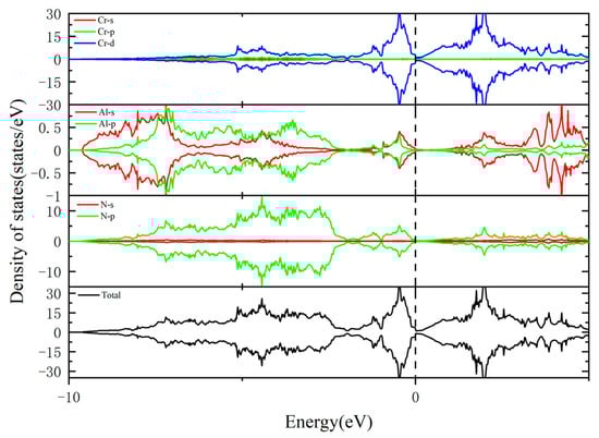 The total and partial density of states (TDOS and PDOS, respectively) of Cr0.5Al0.5N and Cr0.47Al0.5TM0.03N (TM = Ti, V, Y, Zr, Hf, and Ta) were calculated and presented in Figure 8 and Figure 9. The dashed lines denote the Fermi level which is 0 eV. It is found that due to the introduction of impurity atoms, the density of states moves to the lower energy level, indicating the existence of electron transfer between atoms. All compounds have some finite DOS around the Fermi level, which is mainly contributed by the Cr-d and some of the TM-d states, indicating the metallic characteristic. Additionally, the PDOS analysis reveals intricate details about the contribution of specific orbitals to the electronic structure.