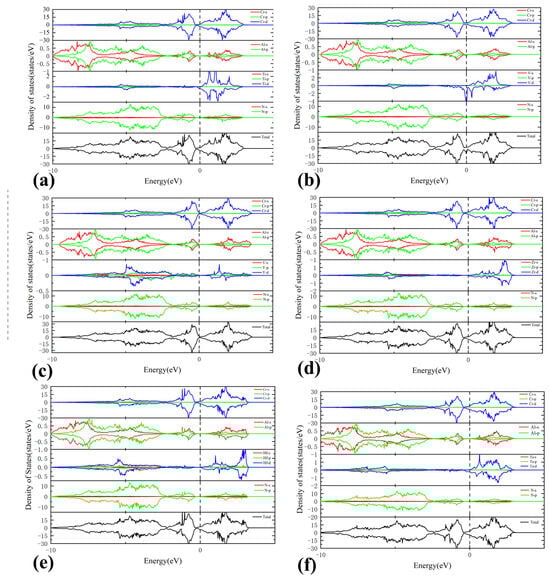 Total and partial density of states. (a) Cr0.47Al0.5Ti0.03N, (b) Cr0.47Al0.5V0.03N, (c) Cr0.47Al0.5Y0.03N, (d) Cr0.47Al0.5Zr0.03N, (e) Cr0.47Al0.5Hf0.03N, and (f) Cr0.47Al0.5Ta0.03N. The vertical dashed line represents the Fermi level.