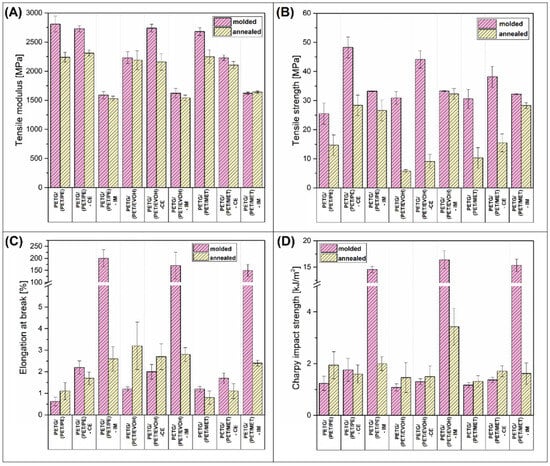 The results of the mechanical properties evaluation for injection molded samples and molded/annealed specimens: (A) tensile modulus; (B) tensile strength; (C) elongation at break; (D) impact strength.