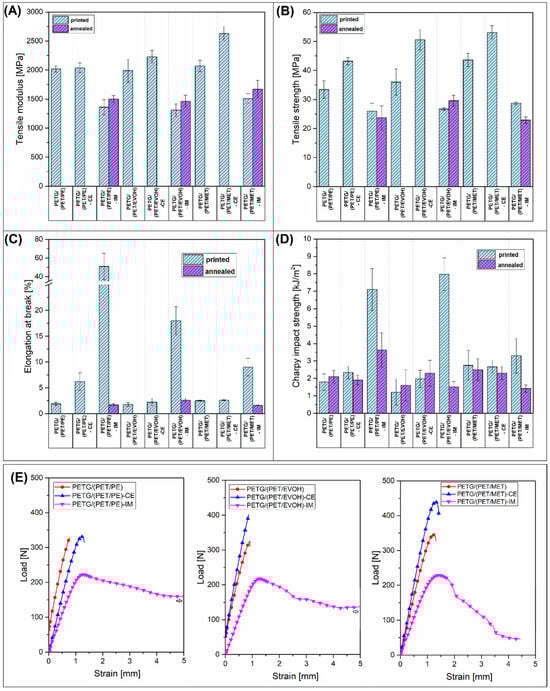 The results of the mechanical properties evaluation for FDM printed samples and printed/annealed specimens: (A) tensile modulus; (B) tensile strength; (C) elongation at break; (D) impact strength; (E) tensile test curves of the prepared (printed) materials.