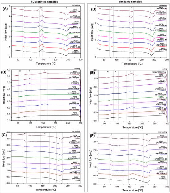 The DSC signals for all of the prepared blends were obtained from the subsequent stages of the test, 1st heating/cooling/2nd heating. The results are collected for FDM printed samples (A–C) and printed/annealed samples (D–F).