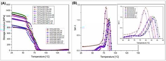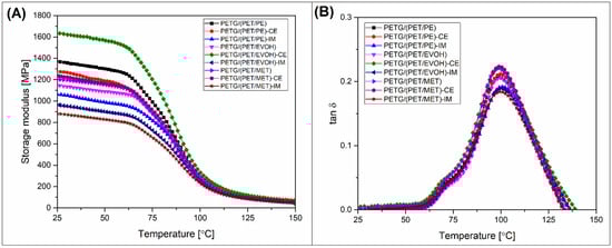 The DMTA results for annealed materials: (A) storage modulus; (B) tan δ.