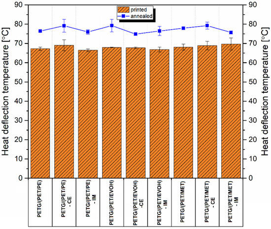 The comparison of the impact strength values revealed slightly better results. The impact resistance for PETG/(PET/PE)-IM and PETG/(PET/EVOH)-IM materials was 7 kJ/m2 and 8 kJ/m2, respectively. However, for PETG/(PET/MET), it drops again to 3.5 kJ/m2. The observed results strongly correlate with the previous studies, where the direct comparison between the molded and printed samples revealed that for the FDM printed samples the strain values are strongly reduced by the structure discontinuities, while the impact strength can even be similar to the results obtained for injection molded samples [63]. Unfortunately, the additional thermal treatment (annealing) led to a large deterioration in sample ductility. The poor results are not surprising for samples without the addition of IM. Still, even when using an elastomer addition, the results return to the reference values recorded for unmodified materials. This behavior clearly indicates a lack of perspective for obtaining good mechanical properties for annealed samples. At the same time, this indicates the need to find another way to improve thermal resistance.
