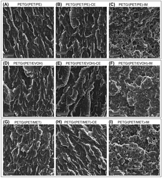 It is clear that for the investigated specimens the main matrix component was the PETG/PET blend. Since the PET-based films contained approximately several percent of PE and/or PE/EVOH, the PETG component had the largest share in the mixture. Interestingly, the structural analysis does not indicate the separation of separate phases of PET and PETG, which suggests at least partial miscibility of these two polymers. The miscibility of PET with other types of copolymers is a confirmed behavior [86,90,91]. Still, the kinetics of this process sometimes depend on the molecular weight or the method of forming the crystalline phase of the individual phases of the mixture [92,93]. Despite the lack of elastomer (IM) addition, the fracture structures for the remaining samples indicate the presence of small amounts of inclusions of the immiscible phase. There are some differences in the size and quantity of these particles for individual samples, but, even without careful image analysis, the content of these inclusions reaches several percent. Inclusions of this type obviously come from the LLDPE fraction present in each of the films used during the preparation of the blend. Similar behavior was observed by Vaucher et al. [64]; however; for the cited research, the addition of HDPE (high-density polyethylene) was used intentionally, while, for the described materials, LLDPE appeared as one of the foil layers; therefore, its presence in the blend was rather undesirable but impossible to avoid. Despite the relatively small amount of PE inclusions, the presence of these inclusions certainly negatively affects the mechanical properties.