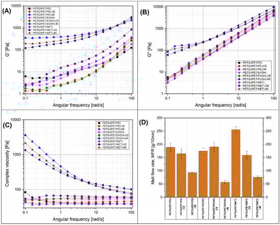 The results of the small-amplitude oscillatory shear tests: (A) G′ storage modulus; (B) G″ loss modulus; (C) complex viscosity. (D) Melt flow rate test (MFR) results.