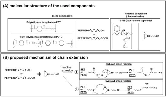 A scheme presenting (A) the structure of the main components of the reactive extrusion process and (B) the proposed reaction mechanism for the prepared blends.