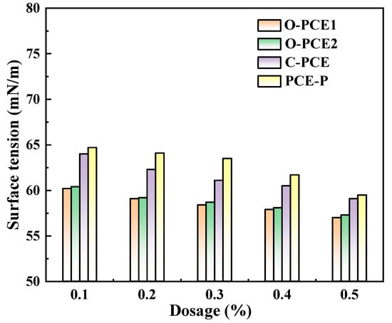 From Figure 1, the incorporation of different PCE types led to a reduction in the surface tension of the cement paste. The surface tension decreased further with an increase in PCE content, and the increase in PCE-P was the most obvious. This can be attributed to the compact and high conversion of monomers, along with the molecular weight distribution of the PCE-P produced by the REDOX system using hydrogen peroxide and ammonium persulfate Vc. This led to an outstanding overall performance, characterized by elongated side chains in comparison to traditional PCE, resulting in enhanced steric hindrance and dispersion.