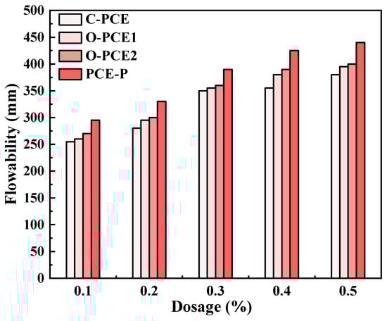 The diagram shows that the fluidity of fresh cement pastes changes with the type and amount of PCE. The initial flowability of cement paste mixed with three kinds of PCE increased continuously with the increase in content, and the maximum increase was 342.8%. The rise in fluidity could account for the escalation in PC adsorption capacity with the augmentation of PCE content, thereby reinforcing the system’s free water absorption capability and fluidity. In addition, the effects of various mineral admixtures (such as silica fume, fly ash, and mineral powder, etc.) on the adsorption and rheological properties of cement have been tested in previous studies, with the results showing that an increase in SCM content will lead to the continuous decline in cement rheological properties [66,67,68,69,70,71].