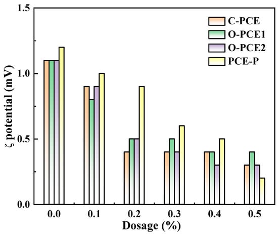 The ζ potential of the cement pastes mixed with PCE was studied by varying the level of the superplasticizer content (0%, 0.1%, 0.2%, 0.3%, 0.4%, and 0.5%) while maintaining a constant water–cement ratio of 0.4 [72]. As shown in Figure 3, the introduction of various PCE types negatively impacted the dispersibility of PC, with a diminishing effect observed in the order of PCE-P, O-PCE2, O-PCE1, and C-PCE.