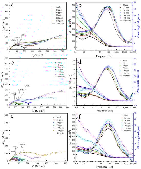 Nyquist (a,c,e) and Bode plots (b,d,f) in the CO2−saturated 5% NaCl containing various concentrations of CV at different temperature: (a,b) 25 °C, (c,d) 40 °C, (e,f) 60 °C.