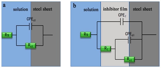 The equivalent circuit models used for fitting the EIS data: (a) in the absence of inhibitor, (b) in the presence of inhibitor.