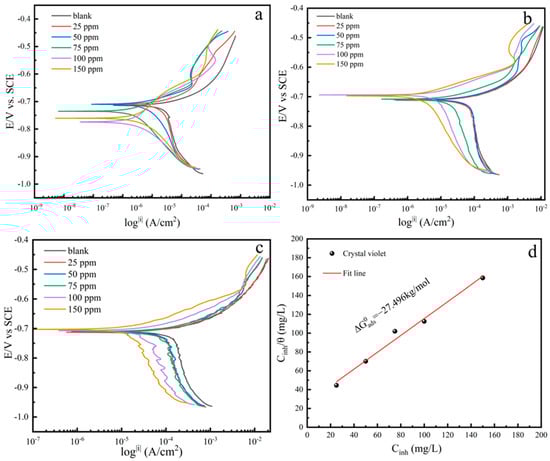 where Cinh represents the concentration of CV, θ is the coverage rate of the corrosion inhibitor on the steel surface (θ = ηp), and Kads is the adsorption–desorption equilibrium constant, which could be determined with the intercept of the Cinh/θ vs. Cinh plots.