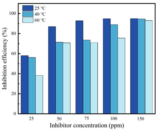 Figure 3a–c show the polarization curves obtained in blank solution as well as with the addition of different corrosion inhibitor concentrations at temperatures of 25 °C, 40 °C, and 60 °C, respectively. It can be seen from the figures that the addition of the corrosion inhibitor results in a shift in both the cathodic and anodic polarization curves to the left to various extents, and the reduction in polarization current density indicates that the corrosion inhibitor has a significant inhibitory effect on both the anodic dissolution and the reduction in cathodic hydrogen ions in the corrosion process of carbon steel [18]. Additionally, the figures reveal that the corrosion potential of this inhibitor does not show significant differences at different concentrations, indicating that CV is a mixed-type corrosion inhibitor [30].