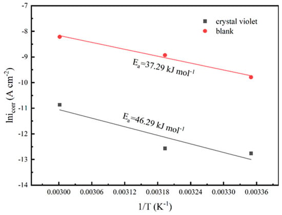 where A represents the frequency factor, Ea is the activation energy, and icorr is the current density of the corrosion inhibitor at 150 ppm. R and T represent the universal gas constant and thermodynamic temperature, respectively. The Arrhenius plots and Ea are shown in Figure 5. As can be seen from Figure 5, the activation energy with the addition of CV (Ea = 46.29) is higher than that of without the inhibitor (Ea = 37.29). This result suggests that the addition of the corrosion inhibitor increases the energy barrier of the corrosion reaction, inhibiting the occurrence of the reaction. Generally speaking, the higher the barrier, the less likely the reaction is to proceed [18]. Therefore, it can be seen that the addition of CV effectively inhibits the corrosion of carbon steel.